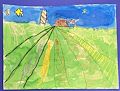 Good job! I see a farm, like what I grew up across from. Many fields of green plants. I wonder is that a blue cloud going to bite the house? Keep painting!