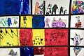 Vibrant colors make this pop. The individual squares with artwork are very interesting and draw my attention. Very fun and creative.