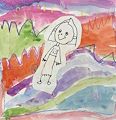 Lainey, I don't know where you get your ideas, but this little purple guy is so cute! Since I'm seeing long eyelashes,( like you) I'm thinking this is a girl. I see her little feet and some dark purple ears and maybe dark purple wings or arms. She looks so happy and peacefull with all the stars around her. Good job and keep up the good work. Love, Great Grandma Pat