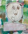 This child's self-portrait features a whimsical, stylized depiction of themselves, drawn with a playful innocence. The round face is the main focal point, with exaggerated, large circular eyes and a wide, toothy grin that gives the drawing a sense of joy and openness. The two visible front teeth are charmingly highlighted, adding character and a touch of humor. The lines are confidently drawn with a clear sense of form, though they remain delightfully unrefined, capturing the spirit of childhood creativity. The background consists of soft, colorful, abstract blotches of greens, blues, and pinks, resembling pastels. This creates a dreamy, almost ethereal atmosphere that contrasts with the boldness of the character in the foreground. Overall, the use of colors, shapes, and expressive facial features suggest happiness and a free spirit.