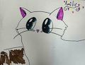 Hi Amelie, What a wonderful drawing Dear. The little white heart shapes along the blue irises if her eyes seem to add emotion to her face. The large white oval shapes in the top of her eyes also add emotion. Where she has no mouth, it makes me wonder, “How does the cat feel?” “Is she sad or does she feel some other way?” I think the way you made simple details like her furry cheeks, whiskers, heart nose with using just one or two lines gives the feeling of the cat really existing as she relates to her environment outside. It is interesting then that her surroundings beyond except for the brown coloring are not drawn yet. Also Amelie, the simplified style gives a feeling of lightness, meaning not so serious like a cartoon instead of being more realistic. Very interesting Amelie. There seems to be some mystery in this excellent drawing! Love, Auntie Mimi