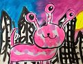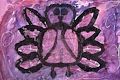 Hi Amelie, What might this creature be? and what is she thinking or doing. What a lovely color purple you used here. I see this creature has eight wings. Does she fly? I also see you made some interesting scratch marks that are reveal white paper underneath. Very cool! Love, Aunti Mimi