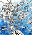 This piece has a lot of depth, and the designs of the zentangle are very detailed, but they still manage to overlap. The colors are placed in an effective fashion where it looks like organisms/cells.