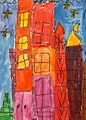Olivia, this really looks like a city. Maybe New York City at night? Your buildings give the impression of apartment buildings with the lights on in the rooms and the stars and moon shining in the background. Skyscrapers, perhaps? The big buildings in the foreground and the smaller buildings behind give the feeling of depth. I love your choice of vibrant colours and patterns. A terrific composition. Well done.
