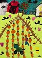 This is the most beautiful pumpkin patch and I love the green tractor and the apple tree. I see a beautiful scarecrow and hay bales. Great art work