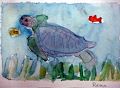 Dear Reina, Your watercolor picture of the wonderful turtle and friends is spectacular! The different gradients of color, your sea "wash" and the lines on your turtle illustrate your true talent. I can see the sea plants floating in the water and your use of more vibrant colors in the foreground adds to the depth of your painting. What a year! What medium do you like working with the most? We'll have to get the paints out when you come to the lake. Much love, Monga