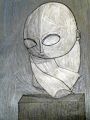 The style of art that you put into this piece is amazing and the light and dark on one side. The shapes of this is outstanding with the small nose and the large eyes. Another thing is that his arms are like taken to the side and he looks curled up.