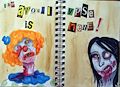 this journal to me looks distractive, which really gets me into this jounral more than i should and i like it that it does that. its like it's not suppose to be in an background that is plain because of the scary almost raw faces there is but it is. i like it. i like it!
