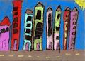 :) Nice work Grace.... reminds me of the scene from Mary Poppins when the chimney sweeps are hopping rooftops. I think because of the buildings- tall & close together & color of sky. It was at night but lots of brilliant blues. (Has she seen that Maryann?) May I request a section for the artist to make comments on their piece? I'd be curious to know what influenced your choices in your interpretation of the original painting. I looked it up to compare, interesting, just wonder what went through that genius mind of yours when deciding what your version would be :)