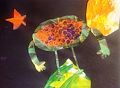 Does your picture have a title? It looks like an alien person with arms and legs standing on a planet near the sun and a star. The alien looks like it is full of spicy cold cereal. It's very creative.