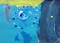 This painting is different in choices of a lot of dark colors and wiggle lines. My Little ELF showing a little stressed with flowing of her colors and lines. Lighten your blues tones up—-this is good. Love Nana