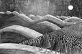 I'm not a skilled art critic, but I think this drawing is a good representation of light, perspective, and depth. The steepness of the hill is emphasized by the tree trunks quickly getting smaller as your eyes look deeper in the trees. The hills and trees show consistent shading on our side and light coming from the rising moon (could be a setting moon I guess). Had to take a lot of time to do this.
