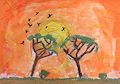 Phoenix, this is so wonderful! I absolutely LOVE your use of texture within the same color for the sky. I can see in the background you used several colors to describe with texture, the sky. The sun radiating out into the sky and a kind of ombre effect is super cool! Also, the shape of the trees is so thoughtful, cozy and remind me of two people connecting and chatting. Did you know that plants and trees actually do this! they do it by way of energy particles. Also I love the shape and way the birds are flappin!
