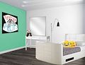 Really nice proportions. The 'Twenty One Pilots' poster and the emoji plush pillows give it a feel of a teenager's room. The bed is in a nice place, and matches with the dresser. Looks cool.