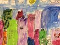 Hi Grace - What a beautiful, vibrant colored piece of art. The buildings in this city-scape scene give you the impression they are watching the streets below. Wouldn't that be funny to see in real life. I understand that you traced the drawing and then painted it. What a great job you did. I love seeing the beautiful rays of sunshine that are present atop the buildings. Keep up the good work. Love you.