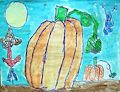 This picture is really , really good. I like the big pumpkin in front of the smaller pumpkin. The coloring is very good ....each pumpkin "seam" has been colored to show how the pumpkin grew. Background makes the pumpkins stand out. I also like the "scarecrow" in the patch and the "bug" I think is afraid of the "scarecrow"