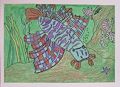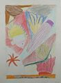 This is a different oil pastel abstract. It almost looks like a bunch of fish swimming in a pile! I like the contrast of bright colors against the dark background - nice work, honey. Love, Mom