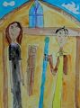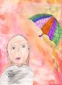 I definitely see a beautiful sky, and I love how it looks like the sun is shinning and transitioning from the top left corner and in down into the page. Your umbrella is definitely blowing in the wind! I love the details of your uniform shirt, and in your eyes as well. Great job, you are my favorite artist! Bravo!!