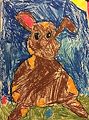 This looks like it could be a few things. A little dude with a horn wearing a red mask with dragon balls floating over his head? or a Pokemon I haven't seen yet. I like it, Charlie Bear. It makes you think!