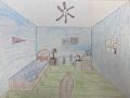 Blue is a great color. Nice use of shape and composition, nice job! If the front wall gets blown down, we can play a game of checkers.