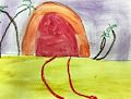 I like this person with her dog in the bright red sun. I think the person and the dog are happy and smiling. So many shapes and colors. Good job.