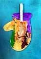 Dear Allison, I is an other great work of art. It is an abstract however with a lot going for it. I see a baby bird, an face of a bear, human scull poking out of the brown and purple on right side of the mitten. In the center two cylinder hugging( love) I see on the left side a giant eagle with tucked and full spread wing in green. Great job.!! Keep up you creative work.