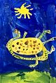 Hi Kennedy, I think this is my favorite painting you painted. It reminds me of having fun in the ocean, seeing a jelly fish swim by, and seeing a bright, blue sky with a Sun high in the sky!! Remember when we went to the ocean? I fell down and took you with me, and then we both started laughing. ??