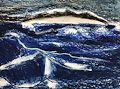 Kennedy, this is my favorite piece so far! I immediately saw the Pacific ocean, where you and I enjoyed the waves, sunshine, and sound of seagulls commanding you to toss more food into the air. Your colors chosen are my favorite blues, and you highlighted the shades perfectly!! I am looking at what appears to be a curl of a wave in the background, with a different hue of blue, calm water behind it. Fabulous! Love you! Nani