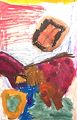 I like the colors in this work. This kind of looks like a long eared doggie to me. Maybe it's a hound dog with brown, red and blue markings?
