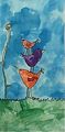 Is this a friendly monster with eyes out above its head with a silly grin and yellow claws walking in the forest? That is what I see in it, great art once again!