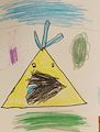Is this a tepee? Looks like one to me. Hope I am not wrong. Or could be a rooster? Since it has eyes, maybe it is not a tepee. Or if it is that is pretty neat, they could be holes to peak out of.