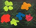 I like the realistic shape you gave to your leaves and the artistic colors. It makes the picture interesting. I can recognize the oak and maple leaves. I also like the way you had the leaves overlap, which is what you see in nature. I also like the big green broken leaf, What a wonderful fall picture!