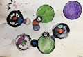 James, I just love this print of circles! Did you dip half an orange to print some of them? And what a good choice of colors! The purple one is a nice contrast for the greens and "combos". Someday, I may choose this to put on a tin box for you, if you like...or you may want to wait until you have several from which to choose for your tin box. When I look at it now, I think the others are all following the purple bubble into the sky!