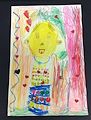 What a great self-portrait! You drew yourself as a happy curious person, interested in the things around you. I can tell that by the smile on your face and the wide-open eyes, looking out at the world. I see a lot of hearts in the picture that make me think you like what you are doing. I also see that you spent a lot of effort getting the details of your clothes just right, and I also see that you are wearing your choker! You made yourself fill up pretty much of the paper, which is important in a self-portrait. You did a fine job on this! I’m glad that you made me one just like it!
