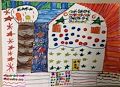 Wow!This picture is dancing! I like the way you filled up the whole picture with different patterns. The patterns give the picture a lot of energy. I also like the way you used the same colors in different ways in different parts of your drawing. I can tell that the house is very important in this picture because it’s in the middle, and is quite large. I see also that happy things go on inside this house because of the kinds of patterns on it and around it. I like all the different kinds of lines you used in this drawing. You’ve used thick and thin lines, short and long, straight and wavy, and vertical,horizontal and diagonal lines. Well done!