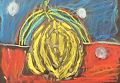 Hi Molly I like how the 3 primary colors are distinct and strong, with the layers on the yellow in the middle and rainbow above. Then there are the 3 white spots buzzing around... trying to figure out what's inside, just like we are. When's it going to come out or let us in ? Thanks, Pop Pop