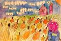 This piece has three of my favorite things…grey, spooky. bare squiggly tree branches, harvest colorful ground that looks like rolling hills and a cool, multi blue shaded sky. LOVE IT and you! Great job!!