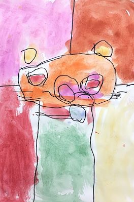 Hi Dylan, I understand that you were supposed to draw something from your imagination. It looks like birds are flying over some mountains. Is that you in the center of the picture? It looks like you're standing in water. I see the sun in the corner. I'll have to ask you about this picture the next time I talk to you to see what you were imagining. Have a great day in school and keep up the great work. Love, Grandma and Grandpa