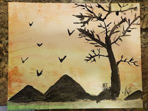 What a BEAUTIFUL landscape. I love how you created the feeling of a sunset, where everything is a black except the warm colors in the sky. Your tree is very detailed.