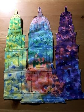 The color effects here are fantastic. It looks like viewing the buildings at different times of day, with warm and cool colors mixed together.