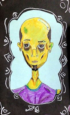 This is so good! I was super proud to see your artwork featured at the fall/ Halloween showcase. I love all the detail. I think your choices of the sunken eyes and cheeks perfectly make him look like he is withering away. I also love your color choices. The simple framing looks great, and I love you included you signature.