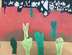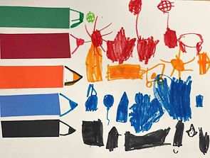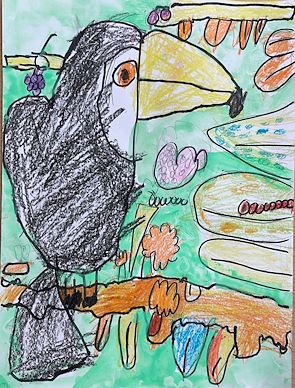 Ilan's artwork uses a charming mixture of organic shapes and watercolor washes to create a visually engaging composition. The leaf-like forms floating in a watery blue-green background evoke a sense of lightness and movement, reminiscent of leaves drifting on a pond or fish swimming underwater. The varied warm colors—yellows, oranges, reds, and purples—stand out effectively against the cooler background, providing good contrast and attracting the viewer’s eye across the piece. The use of simple black line patterns on each leaf adds texture and individuality, suggesting veins but also hinting at scales or other natural details, which adds a layer of visual interest. The watercolor application is loose and fluid, enhancing the natural, unstructured feel, though in some places the colors bleed somewhat unpredictably, which can either evoke spontaneity or appear slightly uncontrolled depending on the viewer’s perspective. Compositionally, the distribution of elements is balanced, with larger shapes leading from left to right and smaller shapes filling in the spaces, creating a rhythm that guides the eye. However, the background area densely layered with green and purple washes can feel a bit heavy and disrupt the overall lightness, making that side somewhat less harmonious with the rest of the piece. Potentially, the piece explores themes of nature’s subtle transitions, the overlap between land and water, or the blending of different life forms in a shared environment. Its whimsical, child-like quality gives it an inviting and playful tone, possibly reflecting an appreciation for simple natural beauty or a moment of peaceful observation. Overall, the work succeeds in evoking a mood and prompting contemplation despite some technical roughness in the watercolor handling. It invites viewers into a serene, imaginative world where the boundaries between leaves and aquatic life blur, creating an intriguing visual metaphor.