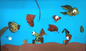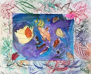 I love the texture you get with all the different leaves around the border! And the multimedia is awesome, the juxtaposition between the watercolors in the middle and the crayon on the border is super cool kiddo! I love it!