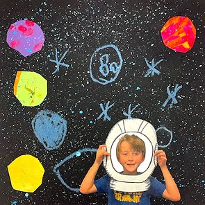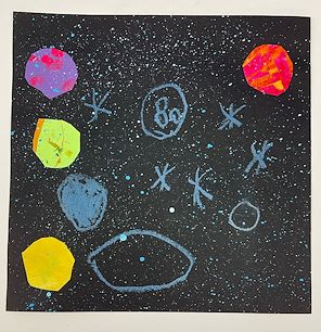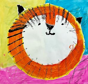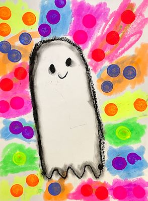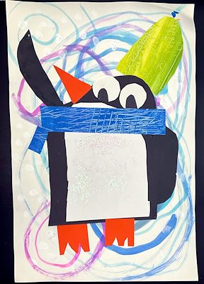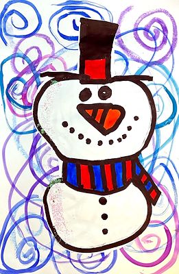 Great subject Kiddo! It makes me wish that we had snow so we could build a snowman together. Oh, and I love the background with the expressive use of color and line art. - Dad