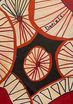 Daniel this is my favorite so far. I love the colors and agree with your mom that it looks like tires and slices of fruit. Next time we talk you will have to share what inspired you create this piece. Love and miss you. Aunt Sue