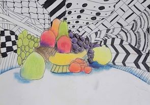 Nice work on the fruit bowl and fruit! Wow, that background has some really interesting patterns! Did it take a lot of time to draw?