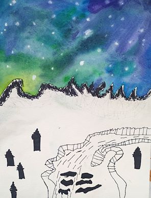 I love the colors you used for your sky! It looks like the northern lights. Love, Mom