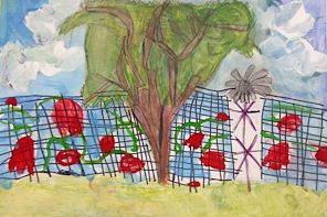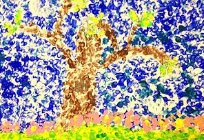 FIRST GRADE students enjoyed their art time outside on our beautiful campus grounds (en plein air). They were asked to draw one special tree, and "not a broccoli." Afterward, students were expected to create their own greens and browns vs. taking the easy route and plopping their brushes into the ready-made paint! The works were filmed in progress during our plein air sessions and also while students were painting indoors. These are complicated works that required observing nature in a three-dimensional environment and visually translating what students observed into a two-dimensional representation! The e-portfolios while in progress are available on my Twitter account @RuthKeefer and also on YouTube (Ruth Keefer art). These delightful landscapes from our own campus would make memorable note cards and/or gifts for your friends and family. Thank you for supporting ParishArts! I would love to take all of these works home with me!