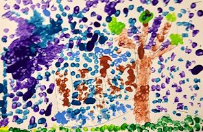 FIRST GRADE students enjoyed their art time outside on our beautiful campus grounds (en plein air). They were asked to draw one special tree, and "not a broccoli." Afterward, students were expected to create their own greens and browns vs. taking the easy route and plopping their brushes into the ready-made paint! The works were filmed in progress during our plein air sessions and also while students were painting indoors. These are complicated works that required observing nature in a three-dimensional environment and visually translating what students observed into a two-dimensional representation! The e-portfolios while in progress are available on my Twitter account @RuthKeefer and also on YouTube (Ruth Keefer art). These delightful landscapes from our own campus would make memorable note cards and/or gifts for your friends and family. Thank you for supporting ParishArts! I would love to take all of these works home with me!