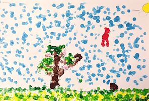 FIRST GRADE students enjoyed their art time outside on our beautiful campus grounds (en plein air). They were asked to draw one special tree, and "not a broccoli." Afterward, students were expected to create their own greens and browns vs. taking the easy route and plopping their brushes into the ready-made paint! The works were filmed in progress during our plein air sessions and also while students were painting indoors. These are complicated works that required observing nature in a three-dimensional environment and visually translating what students observed into a two-dimensional representation! The e-portfolios while in progress are available on my Twitter account @RuthKeefer and also on YouTube (Ruth Keefer art). These delightful landscapes from our own campus would make memorable note cards and/or gifts for your friends and family. Thank you for supporting ParishArts! I would love to take all of these works home with me!